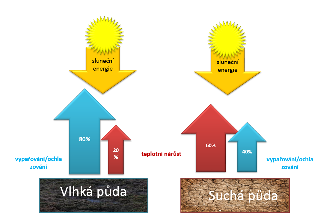 Sluneční energie, která dorazí k půdě je dále přenášena buď ve formě tepla, nebo rozptýlena vypařováním a navrátí se prostřednictvím kondenzace (deště). Suchá oblast bez vody nemůže teplotu odbourávat, a tak během dne v této oblasti teplota rychle stoupá. K opačnému procesu dochází v noci, kdy bez přítomnosti vlhkosti teplota zase rychle klesá: jedná se o skleníkový efekt a kondenzaci vody (rosa a déšť). To je důvod, proč je vhodné si na Saharu vzít teplou peřinu.