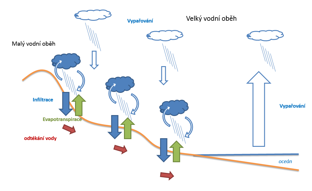 Ano, vypařování vody nespotřebovává pouze sluneční energii, ale ovlivňuje vznik páry, která se může vysrážet a tvořit mraky a navracet se do půdy ve formě srážek a uzavírat tak vodní cyklus. Rozlišujeme dva vodní cykly: velký, který je charakteristický pro výměnu vody mezi oceány a kontinentem. Probíhá následovně: vypařování vody z oceánů, vznik mraků a jejich pohyb pod působením větru, návrat do půdy ve formě deště, přetrvávání na horách v podobě sněhu, návrat do oceánů skrze řeky atd. Hlavní charakteristikou velkého vodního cyklu je horizontální dynamika, tzn. že vlhkost před opětovným dopadem na zem může překročit velké vzdálenosi: to je cyklus globální rovnováhy na kontinentální úrovni.